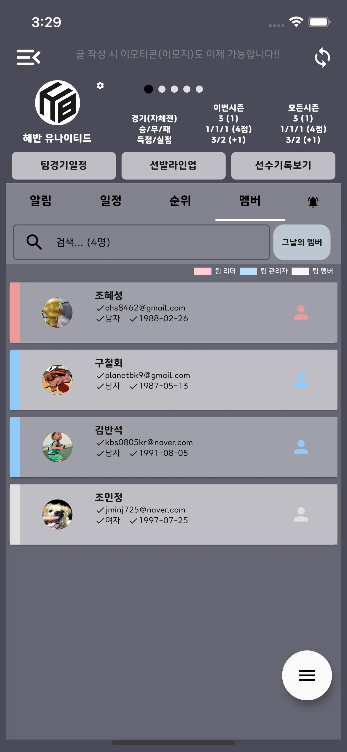 "그날의 멤버"란 동네축구에 가입이 어렵거나, 해당 팀에 가입이 어려운 멤버를 추가 하는 기능입니다.