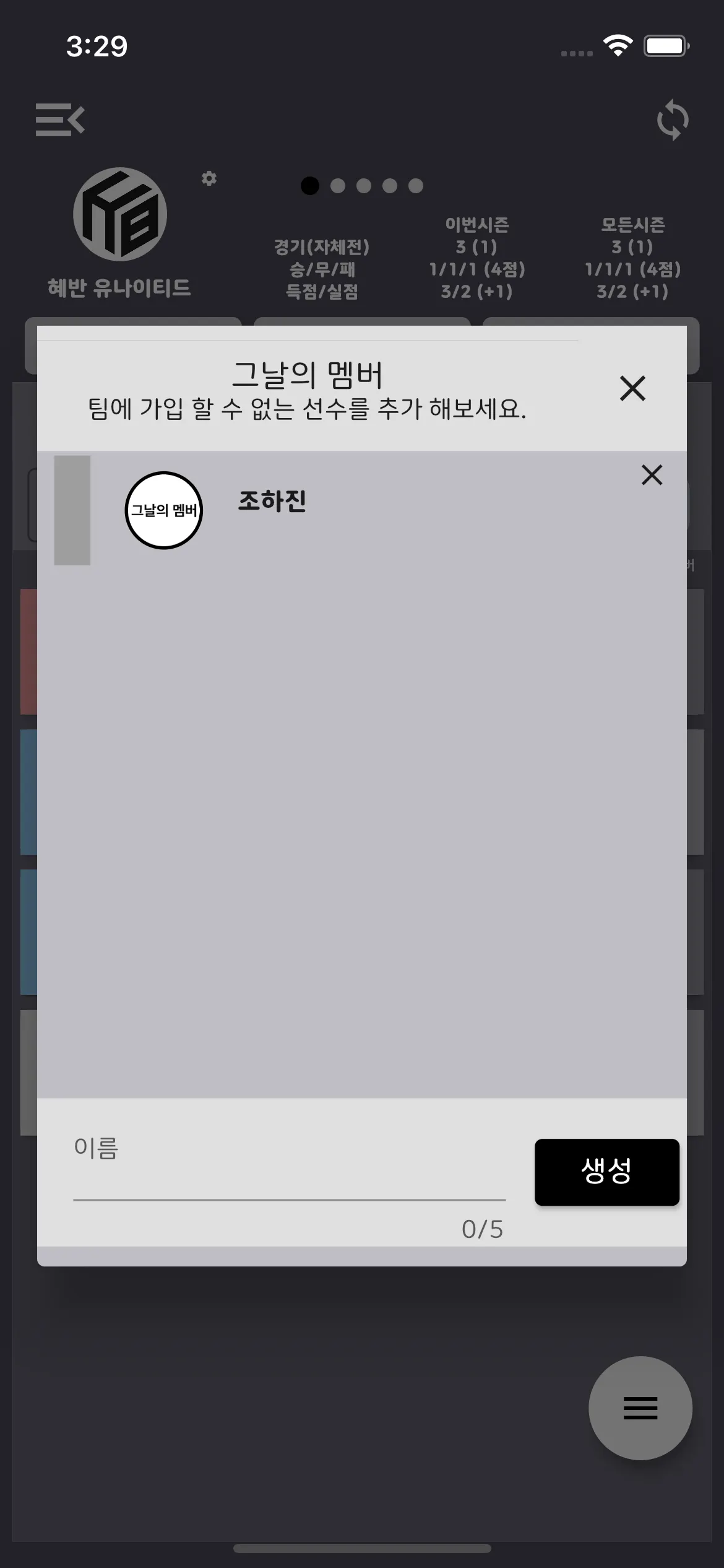 그날의 멤버의 이름을 하단에 입력하고 생성을 터치하면 그날의 멤버가 생성이 됩니다.